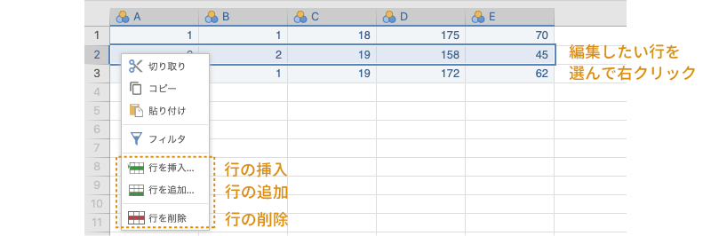 今度は,入力済みデータを行・列の単位で編集する方法についてみてみましょう。jamoviでは,データの行と列はそれぞれ異なった意味をもちますので,追加・削除のメニューは行と列のそれぞれに別々に用意されています(図 3.8)。