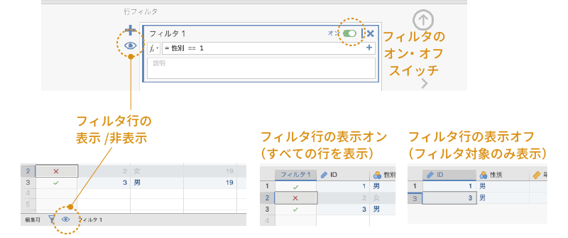 フィルタ設定パネルの条件式ボックス右上にあるスイッチでは,フィルタのオン・オフをフィルタごとに個別に切り替え可能です。フィルタを使用しない場合は,忘れずに「オフ」にしておきましょう。