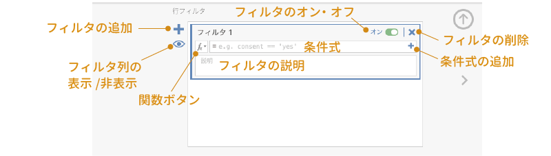 画面中央の部分がフィルタの条件式を設定する部分で,最初の関数ボタンとボックスは計算変数や変換変数の場合と基本的には同じです。ただ,ここには計算式ではなく,表示させるデータの条件を示す式を記入します。条件式を複数使用したい場合は,ボックスの右側にある小さいほうの「」ボタンをクリックすると条件式を追加できます。