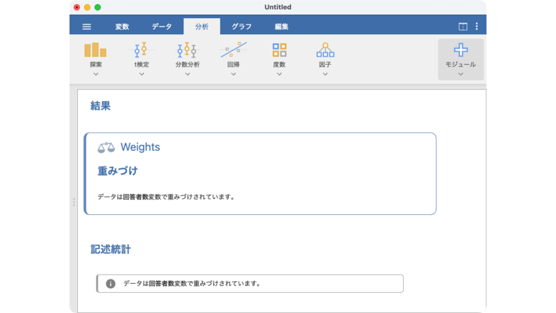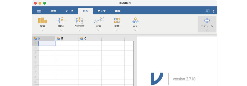 このように,分析タブのツールは分析手法ごとに非常にわかりやすく整理されています。また,これらの基本メニューに加え,画面の一番右には「 モジュール」というツールもあります。これはjamoviにさらに高度な機能を追加したい場合に使用します1。
