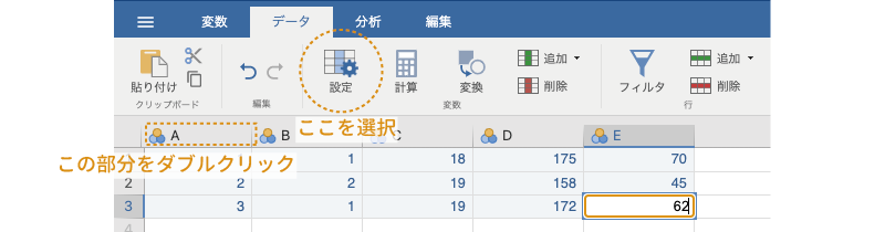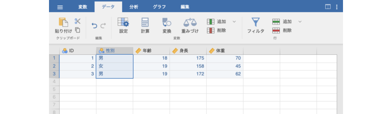 では,実際にスプレッドシートにデータを入力してみましょう。ここでは表 3.1のデータを用いることにします。変数タブが選択されている場合には,データタブを選択してスプレッドシートを表示させてください。