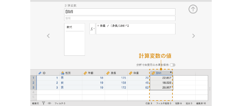 これに対し,jamoviでこれらの処理を行った場合には,仮に元のデータに修正が生じたとしても,計算変数や変換変数の値は自動的に最新の内容に更新されるため,計算し直す必要がありません。分析データを確実に最新の状態に保てることは,jamoviでデータ処理を行う大きな利点といえます。