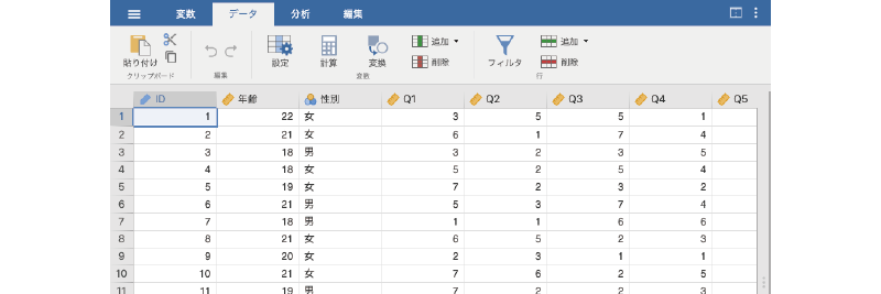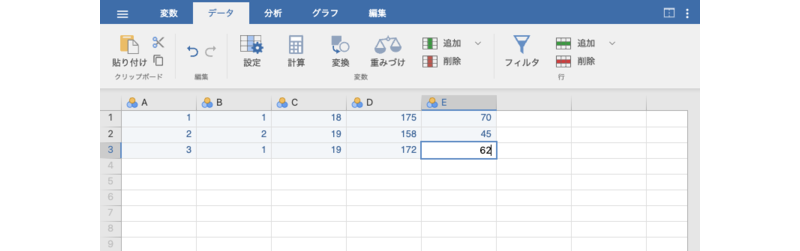 このように,jamoviではExcelなどの表計算ソフトを操作する感覚で簡単にデータ入力を行うことができます。