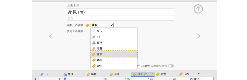 関数ボタンと数式ボックスの使用方法は計算変数の場合と同じです。必要に応じて関数ボタンで変数名や関数を選択し,数式ボックスの中に変換式を記入します。今回の変換ではセンチメートルで記録された身長のデータをメートルに変換するので,数式ボックス内の式は「$source / 100」となります(図 3.27)。なお,「$source」は変換元の値を意味します。