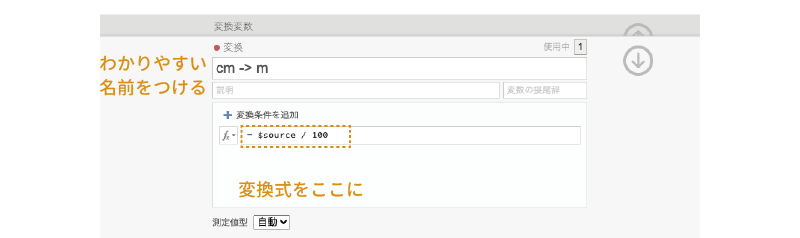 最初の部分はこの変換の名前です。再利用する際に便利なように,できるだけわかりやすい名前をつけておきましょう。今回の変換はセンチメートルからメートルへの変換ですので,「cm -> m」という名前にしておきます。