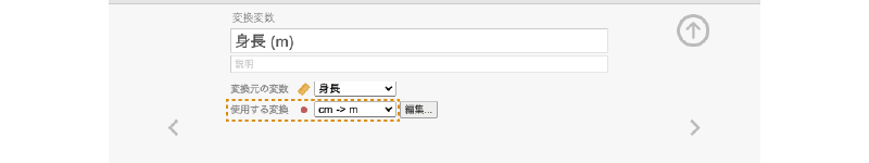 すると,「使用する変換」の部分が先ほど作成した「cm -> m」になっているはずです(図 3.28)。この変換変数も,計算変数の場合と同様に,変換元の変数値が変化すると自動的に値が更新されます。また,この変換式は,その右横にある「編集…」ボタンをクリックすることで修正可能です。変換変数は,スプレッドシートでは変数名の欄の右上に赤丸がついた状態で表示されます。