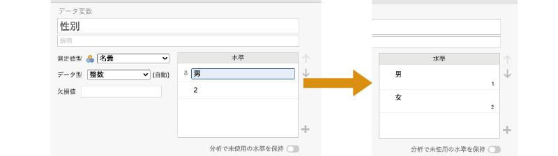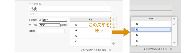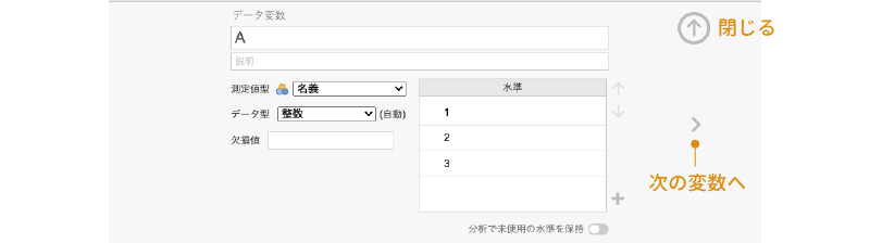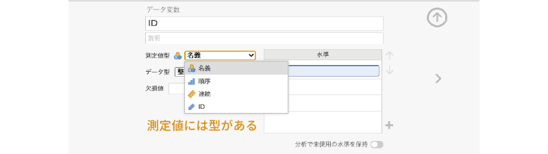 scatrという拡張モジュールが標準でインストールされており,このモジュールをオンにすると探索ツールに「Scatterplot(散布図)」と「Pareto Chart(パレート図)」というメニュー項目が追加されます。これらの項目については,本書では省略します。↩︎この他に結果変数などもありますが,これらは分析によって自動的に作成されるもので,基本的に編集できません。そのため,ここの説明には含めません。↩︎