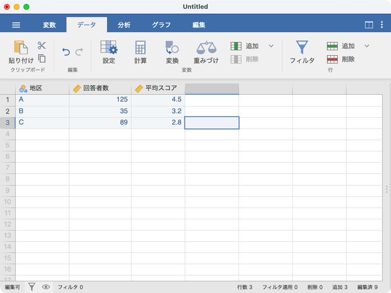 データタブはデータの入力や編集の際に使用します。見た目はExcelなどの表計算ソフトによく似ています(図 3.3)。