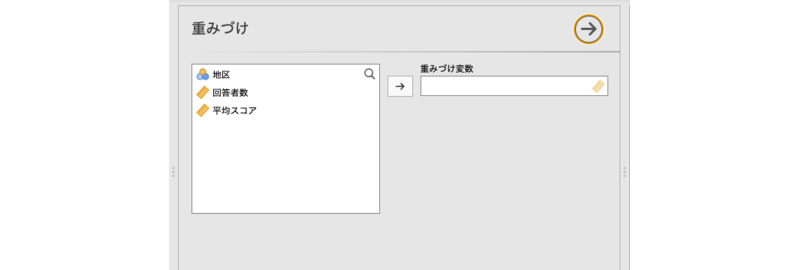 設定パネルの左側は,データに含まれる変数一覧です。ここから「回答者数」を選択し,それをダブルクリック,またはマウスでドラッグして右側の「重みづけの変数」に移動させると,結果ウィンドウに次のように表示され(図 3.31),以後の分析では回答者数を考慮した値が算出されるようになります。この状態で,「平均スコア」の平均値を求めると,その値は3つの値の平均値ではなく,249人の回答値の平均値になるのです。