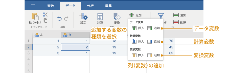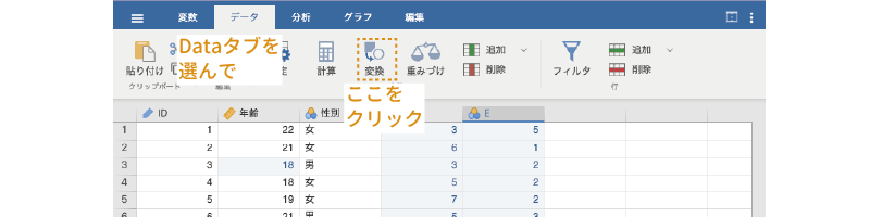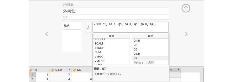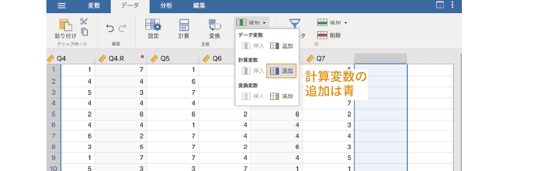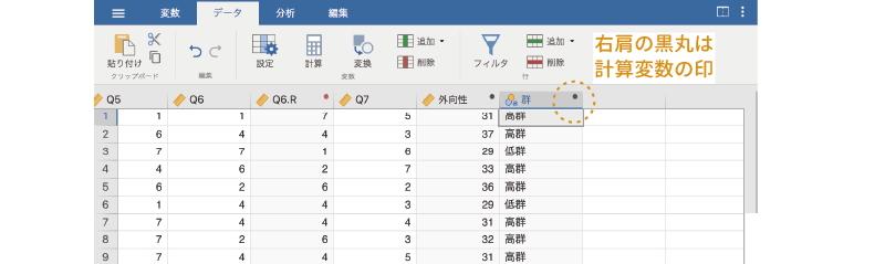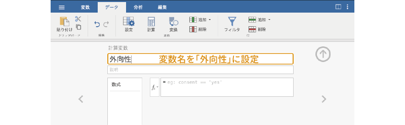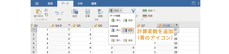 この「外向性尺度」の尺度得点は,データの一番最後の列に新たな計算変数として作成しましょう。データタブの「変数」の欄にある「 追加」を使用して,新たな「計算変数」を「