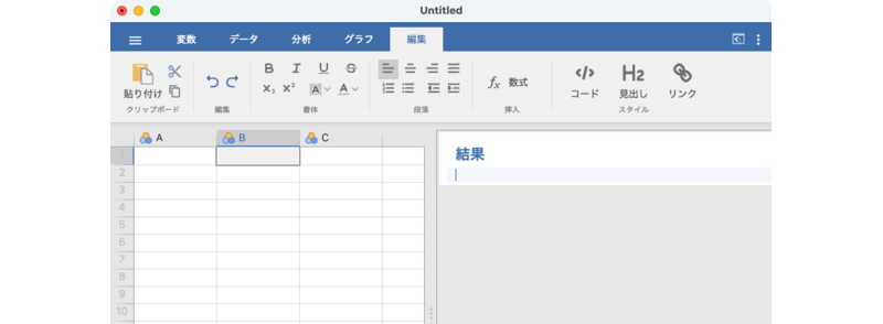 基本的に,統計処理をするデータは各行が1人分(あるいは1試行分)の測定値で,各列はさまざまな変数(参加者番号や年齢,性別など)となります。なお,jamoviを起動した直後の画面にはA,B,Cの3つの変数しかありませんが,4列目以降にも値を入力することができます。空白の列に値を入力すると,その列は新たなデータ変数として扱われます。