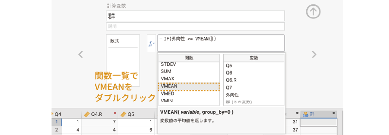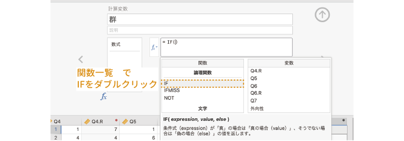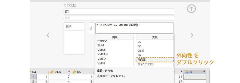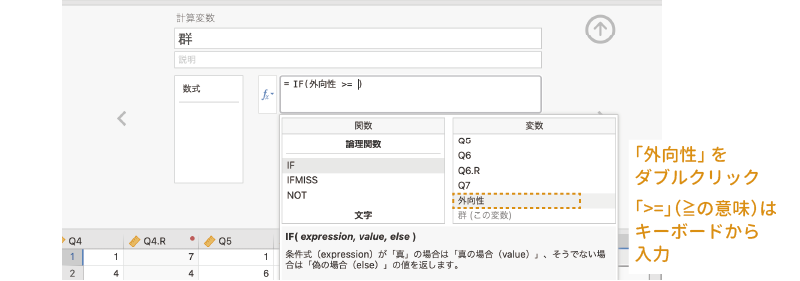 この「外向性 >= VMEAN(外向性)」の式が,「\(\text{外向性得点} \geqq \text{外向性得点の平均値}\)」を意味します。この条件式に続けて,条件式にあてはまる場合の値として「高群」,あてはまらない場合の値として「低群」を,それぞれコンマ(,)で区切って入力します (図 3.58)。このとき,変数値に「高群」や「低群」のような文字を用いる場合には,その値を引用符(““)で括る必要がありますので注意してください。