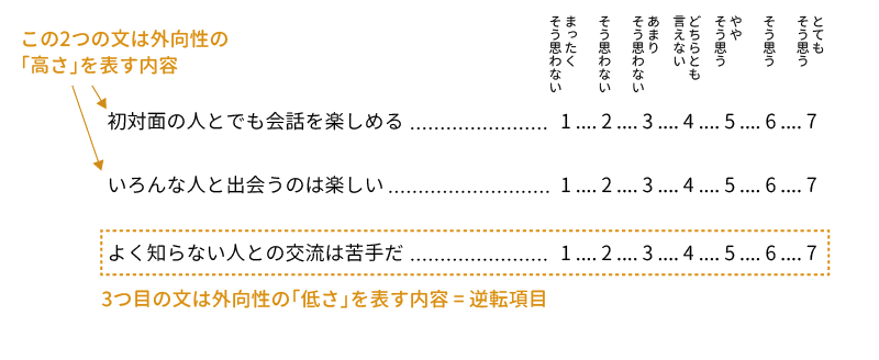 この際,それらの質問文の中には「よく知らない人との交流は苦手だ」のような,外向性の高さとは逆の内容の文が含まれていることがあります。このように,本来測定したいものとは逆の内容を含む質問文のことを逆転項目といいます(図 3.38)。