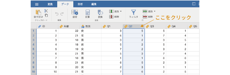 まず,「Q2」の列名のところをクリックして,「Q2」の列を選択します(図 3.39)。