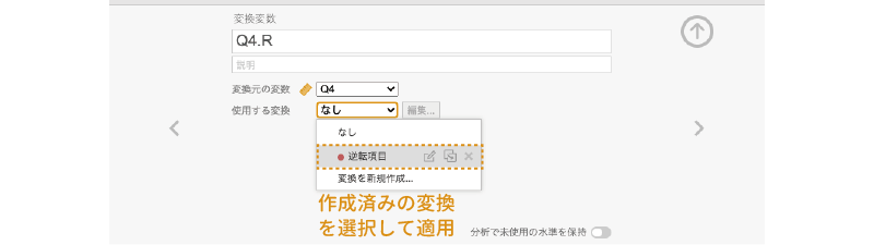 この「逆転項目」を選択して変数設定パネルを閉じれば「Q4」の逆転処理は完了です。このように,一度作成した変換式は繰り返し利用できますので,逆転項目が複数ある場合には変換変数で逆転処理を行うのが便利です。