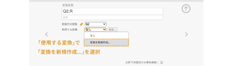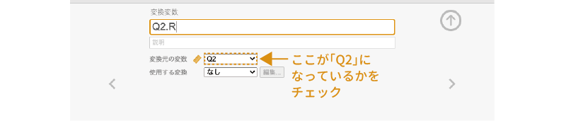 すると,図 3.41のような変換変数の設定パネルが表示されますので,作成した変換変数の名前を「Q2.R」に設定しましょう。このとき,「変換元の変数」の部分が「Q2」になっていることを確認してください。