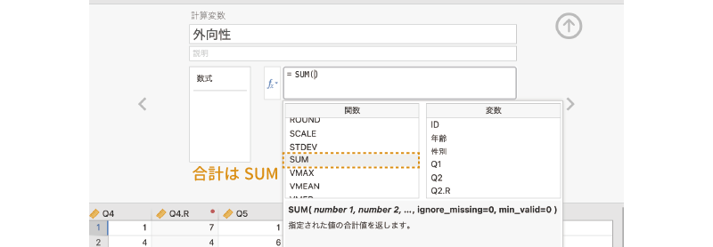 変数名の設定ができたら,その下の計算式の部分に,変数値を合計するための式を入力します。ここでは尺度得点として回答値の合計を用いるので,関数ボタン()で表示される関数の中から「SUM」を探してダブルクリックします (図 3.49)。この「SUM」という関数は,括弧の中に指定された値の合計値を求める関数です7。