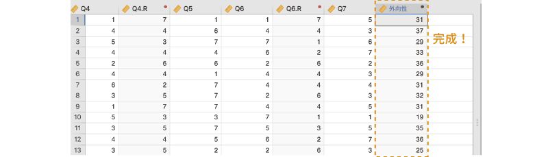 式の入力が終わったら,画面右のをクリックして変数設定パネルを閉じます。これで各対象者の外向性得点(合計値)が算出されました (図 3.51)。