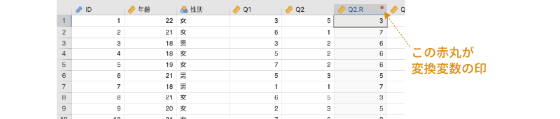 で変数設定パネルを閉じると,「Q2」のすぐ後ろの列に「Q2.R」という変換変数が作成されていることが確認できます (図 3.45)。この変数が変換変数であることは,変数名の部分の右肩に小さな赤丸がついていることから判断できます。
