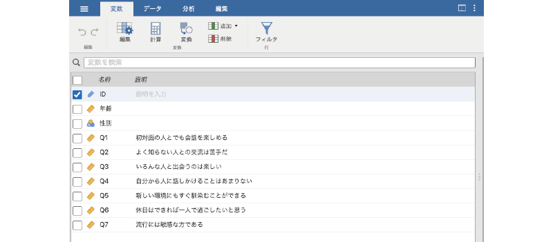 このデータファイルには,「ID」,「年齢」,「性別」の各変数値と,「Q1」から「Q7」までの回答値が入力されています(図 3.36)。「Q1」から「Q7」は,それぞれ「外向性」を測定する心理尺度の回答データで,いずれも「まったくそう思わない(1)」から「とてもそう思う(7)」までの7段階で回答されています。「Q1」から「Q7」の質問内容は,変数タブで確認することができます(図 3.37)4。
