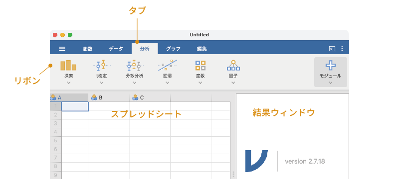 jamoviの画面は,次の要素で構成されています(図 3.1)。