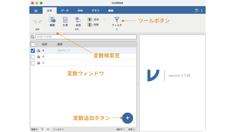 画面上部にはツールボタンのリボンが,中央には変数ウィンドウが,画面下には変数追加ボタンがあります。また,変数の検索窓も用意されており,データにたくさんの変数が含まれている場合にはここに変数名を入力することで目的の変数をすばやく見つけられます。