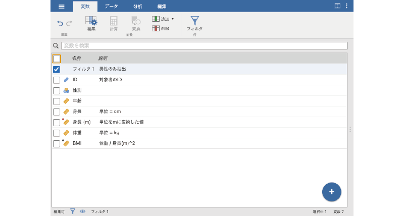 ここまでの作業で作成した変数やフィルタは,「変数」タブで一覧することもできます。図 3.35は,ここまでに作成した変数やフィルタに「説明」をいくつか追加した状態です。このように,変数タブでは変数名と変数の説明がウィンドウに一覧表示されるので,変数名を英数字にして「説明」欄に日本語で説明を記入した場合や,質問紙調査データで「説明」欄に質問文を入力した場合などには,このタブは重宝することでしょう。