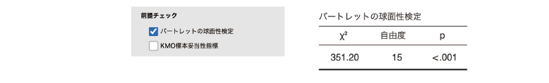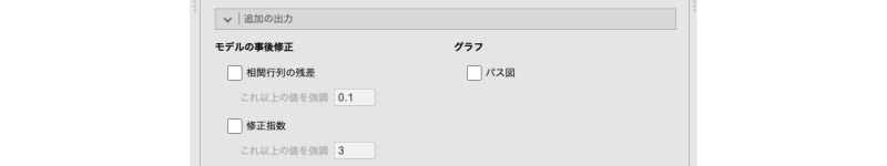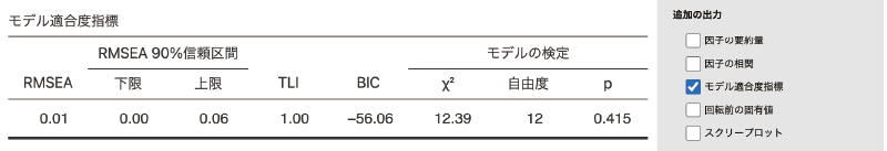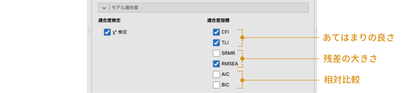 画面左側の「適合度検定」の部分では,モデルの適合度に関して\(\chi^2\)検定を行うかどうかを設定できます。この検定では,「このモデルはデータがもつ情報を完全に説明できている(モデルによる残差が0である)」が帰無仮説ですので,この検定結果は有意にならない(pが0.05より大きい)ことが望ましいという点に注意してください。