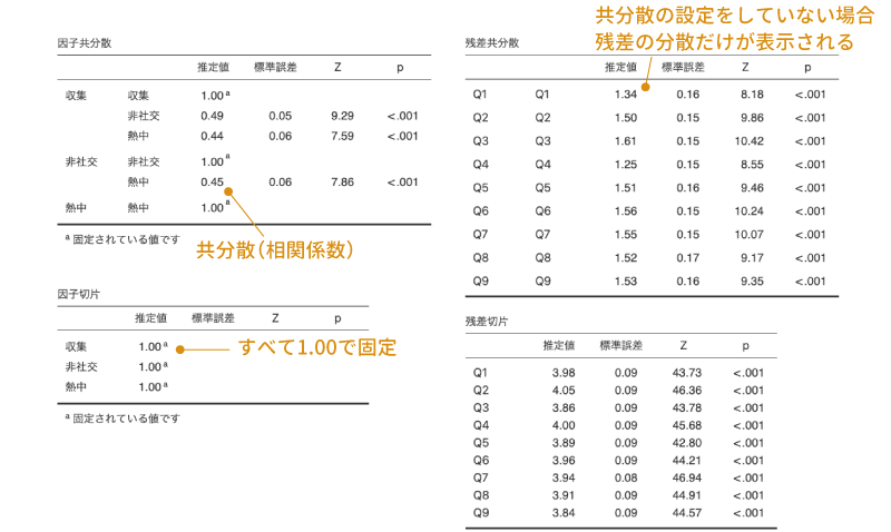 3つ目の「残差共分散」の項目にチェックを入れると,各観測変数の残差の分散が表示されます。また,の設定で共分散を算出するように設定した場合には,設定した観測変数のペアについて,算出された共分散の値が表示されます。