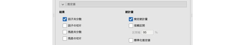 この画面の結果の部分では,因子と各観測変数の残差の分散・共分散と切片の算出結果を表示するかどうかについての設定を行います。