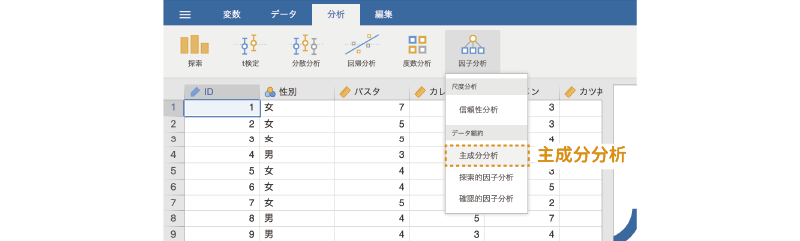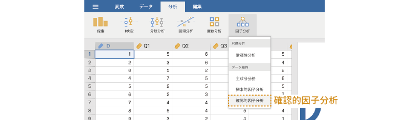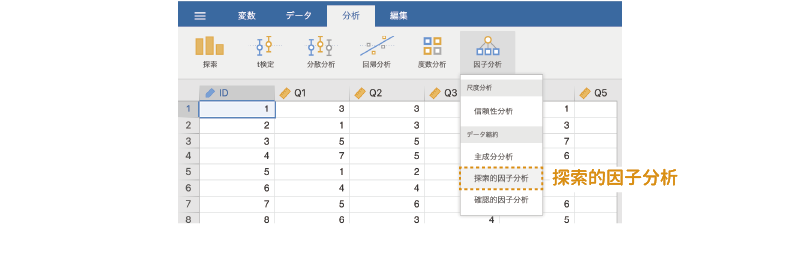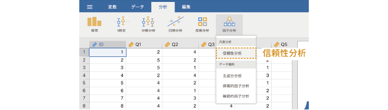 このデータについて信頼性分析を実施するには,分析タブの「 因子分析」から「信頼性分析」を選択します(図 10.3)。