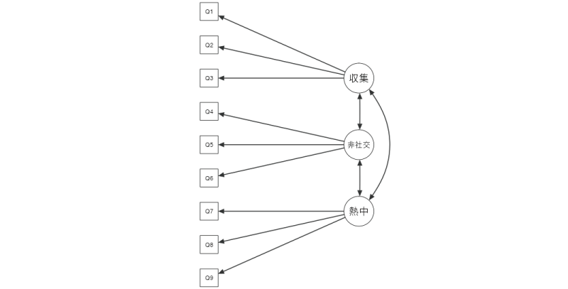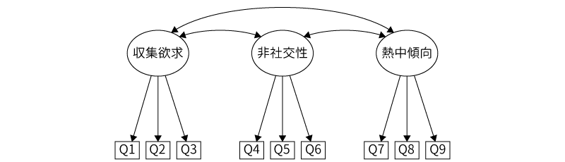 この分析結果では,適合度指標はCFI=1.00,TLI=1.00,RMSEA=0.00[0.00-0.04]で,いずれも適合のよさを示しています。したがって,今回の外国人を対象としたデータの場合にも,前回の分析結果で得られた3つの共通因子でうまく説明ができる,つまり,外国人の場合にも日本人と同じオタク傾向の3因子モデルがあてはまるということになります。