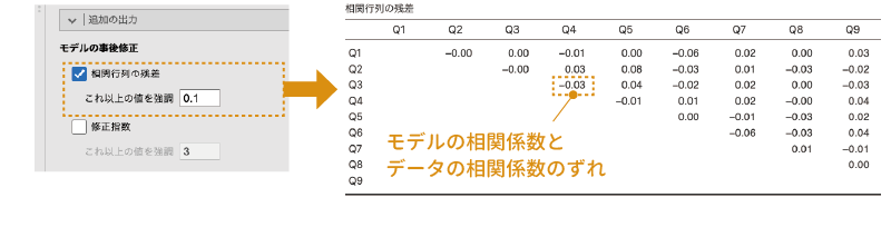 そのための参考指標の1つが,モデルから算出される観測変数間の相関係数と,実際のデータにおける観測変数間の相関係数の間の残差です。相関係数の残差を算出するには,「相関行列の残差」の部分にチェックを入れます。またその際,「これ以上の値を強調」に指定されている数値より大きな絶対値の部分が赤色の文字で強調表示されます(図 10.75)。