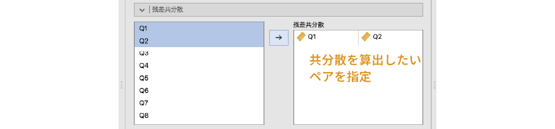 この残差共分散(誤差共分散とも呼ばれます)を算出するには,ここで残差の共分散を算出したい変数のペアを選択し,それを右側の「残差共分散」の欄に移動します。なお,「 回帰分析」メニューの「相関行列」で相関係数を算出する場合とは異なり,ここでは共分散を算出させたい変数のペアを個別に指定する必要があります(図 10.67)。