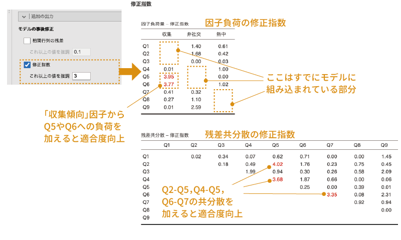 この結果の1つ目の表から,「収集傾向」の因子で「Q5」と「Q6」の部分が赤になっていますから,現在のモデルに対してこれらのパス(「収集傾向」因子から「Q5」と「Q6」への因子負荷)をモデルに追加すると,さらにモデルの適合度が向上する可能性が高いということがわかります。