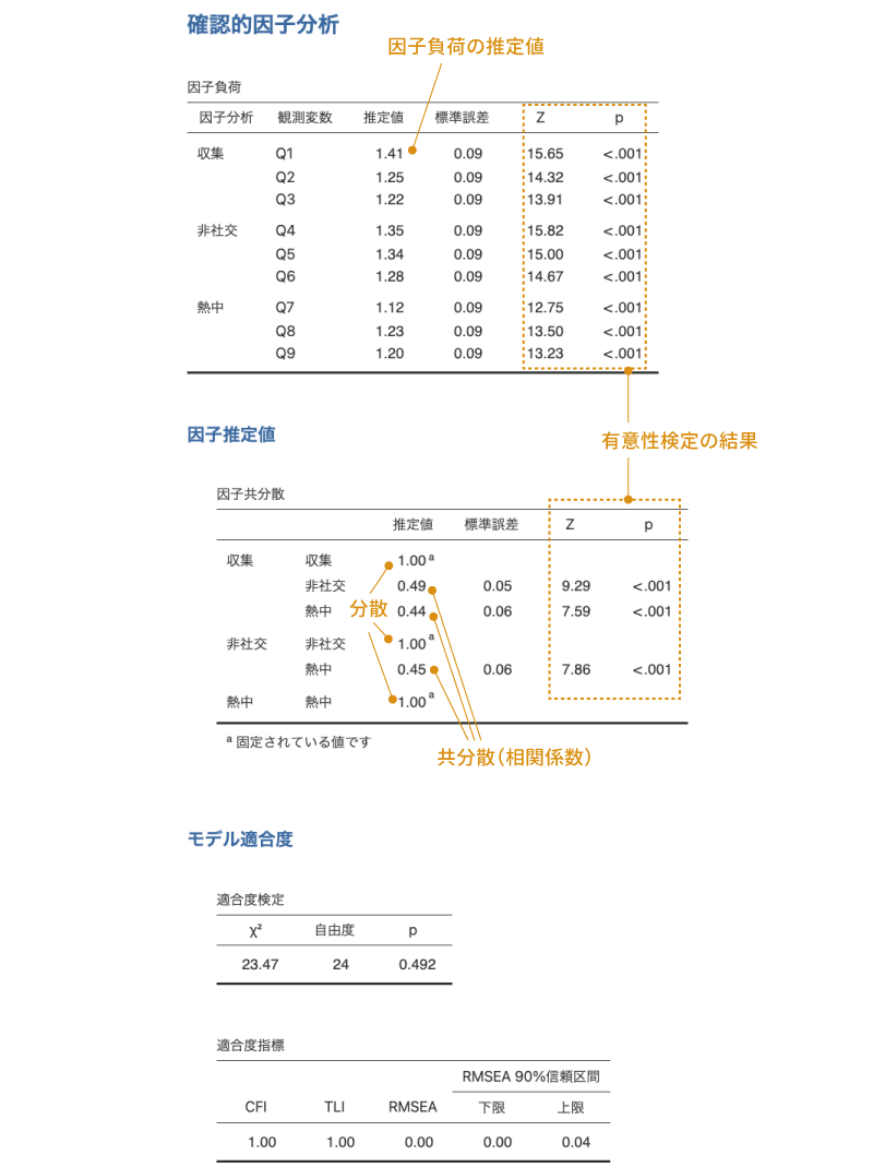 - \(\chi^2\)検定 モデル適合度についての\(\chi^2\)検定の結果を表示します。
