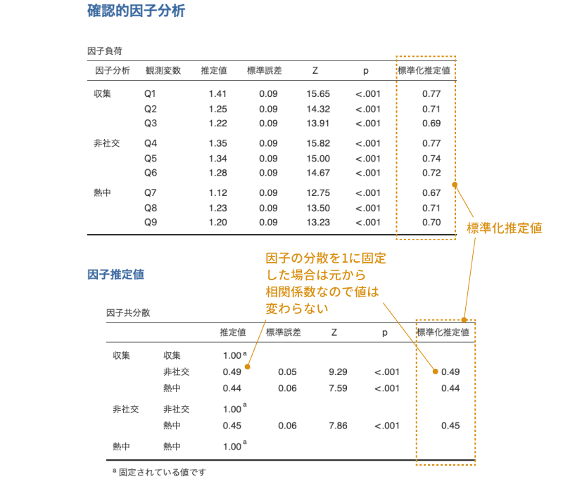 3つ目の「標準化推定値」にチェックを入れると,各係数を標準化した値が表示されます。この標準化推定値の値は,のところで計算上の制約として「因子の分散を1に固定」を選択した場合にも「最初の係数を1に固定」を選択した場合にも同じになります(図 10.71)。