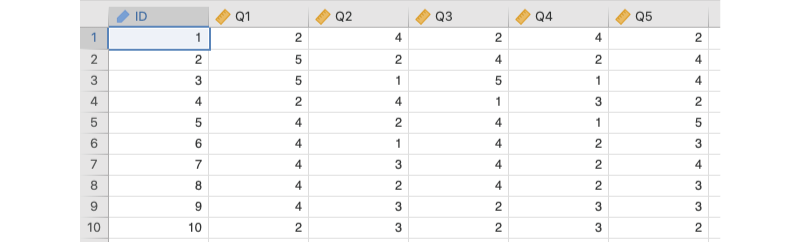 実際,このサンプルデータでは,「Q1」と「Q3」,「Q5」はメッセージアプリの使用が多いほど回答値が大きくなる質問ですが,「Q2」と「Q4」はその逆で,メッセージアプリをあまり使わない人ほど回答値が大きくなるような,逆内容の質問です。このような,他の質問とは逆内容の質問を含む項目は逆転項目と呼ばれ,内的一貫性の分析においては,これらはそのままでは分析できません。