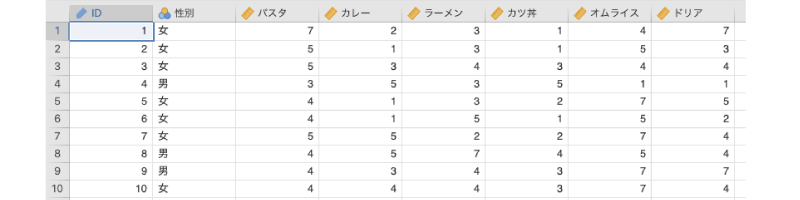 ID回答者のID性別回答者の性別パスタパスタに対する満足度カレーカレーに対する満足感ラーメンラーメンに対する満足感カツ丼カツ丼に対する満足感オムライスオムライスに対する満足感ドリアドリアに対する満足感