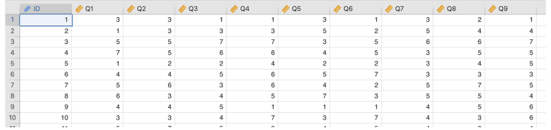 ID対象者のIDQ1「メッセージアプリをよく使う」への回答値Q2「メッセージアプリよりメールで連絡することのほうが多い」への回答値Q3「メッセージアプリでやりとりするのは楽しい」への回答値Q4「メッセージアプリは何かとめんどくさい」への回答値Q5「送信メッセージに反応がないとソワソワする」への回答値