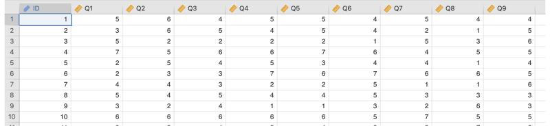 ここでは,このサンプルデータ(factor_data01.omv)を用いて尺度の内的一貫性について分析してみましょう。このデータは「メッセージアプリ志向尺度」を用いて測定されたもので,次の変数が含まれています。なお,各質問への回答は,いずれも「1:まったくあてはまらない」から「5:とてもよくあてはまる」までの5段階です(図 10.2)。