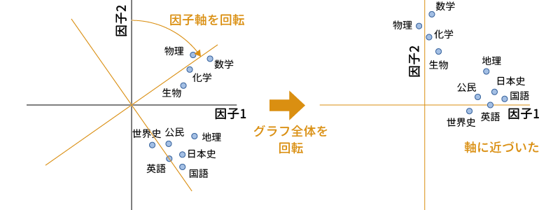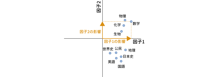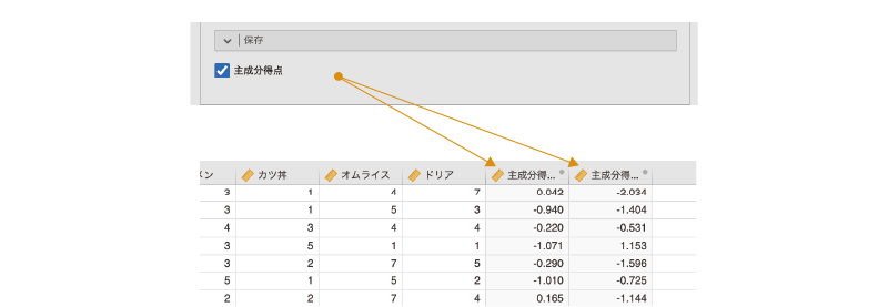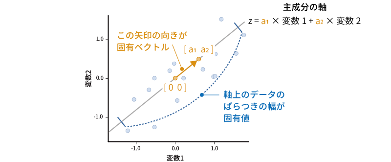 先ほどの2変数の例の場合,情報を集約する軸の式は,\(z=a_1\times\text{変数}_1+a_2\times\text{変数}_2\) となります。つまり,2つの変数の値になんらかの重みづけを行ったうえで合計するという形で合成得点を作成するのです。そして分析においては,このような変換によって失われる情報量が最小となるように,この式における重みづけの部分の値を決定します。