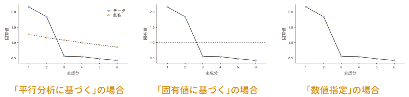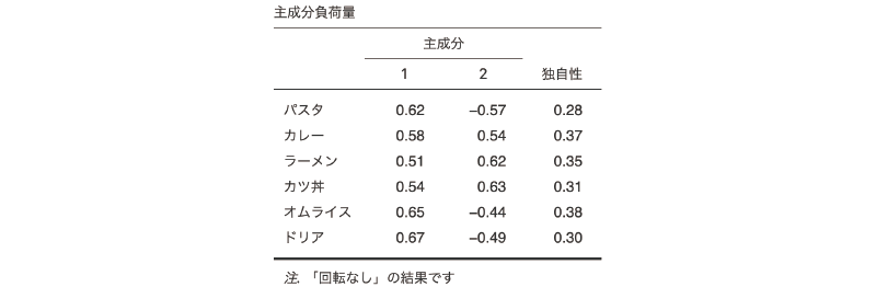 もし因子の分散という情報が分析上重要である場合には,「最初の係数を1に固定」に設定して計算を行うことになるでしょう。その場合,各因子の分散の値は算出されますが,各因子の最初の変数では,その係数(因子負荷量)はすべて1になります。