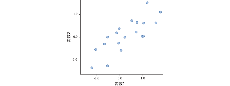 ここに,r=0.8の正の相関関係にある2つの変数があるとします。相関係数が0.8の変数の値を散布図に示すと,おおよそ図 10.15のようなものになります。