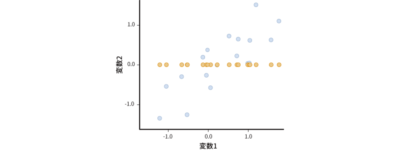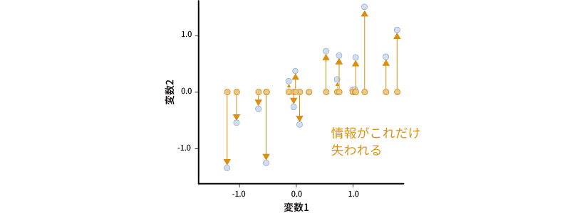 ただし,これでは単に変数2がもつ情報(y軸がもつ情報)を捨てているだけですので,2つの軸がもつ情報を1つの軸に集約したことによって,多くの情報が失われてしまいます(図 10.17)。