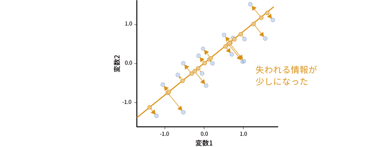 すると,先ほどの場合よりも失われる情報の量がずっと少なくなりました。このような形で情報を集約できれば,2つの軸で表現される情報を1つの軸で表現したとしても,もとの情報が多く損なわれてしまうということがありません。
