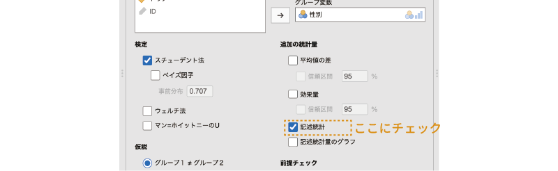 尺度統計量の「平均値」と「標準偏差」にチェックを入れると,尺度全体の回答値の平均と標準偏差が算出されます。