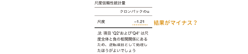 まず,この結果ではクロンバックのアルファの値がマイナスになっており,これは明らかに計算が正しくありません。そして,この表の下には何やら注釈が長々と書かれています。この注を見てみると,「項目’Q2’および’Q4’は尺度全体と負の相関関係にあるため,逆転項目として処理したほうがよいでしょう」と書かれています。