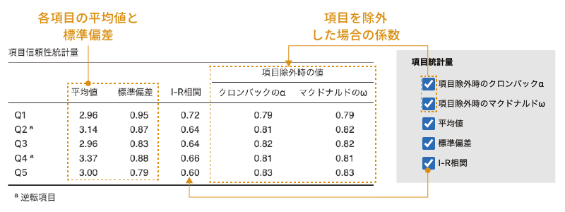 項目統計量には,尺度を構成する個別の質問項目について吟味するための項目が含まれています。