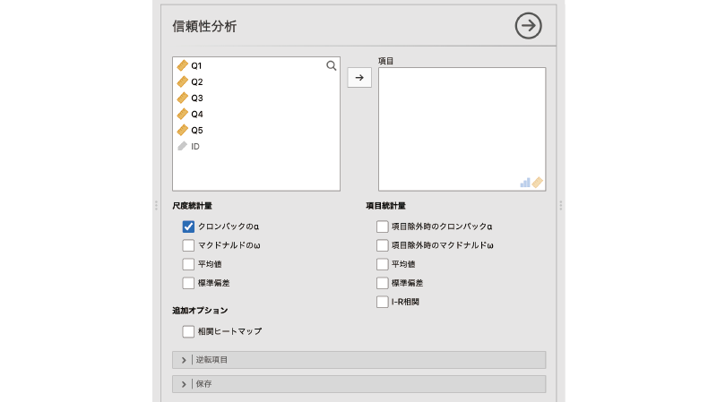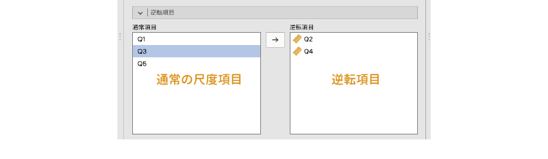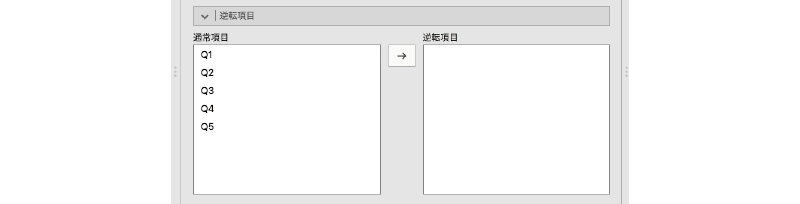 尺度を構成する質問の中に逆転項目が含まれている場合には,分析設定パネルの[逆転項目]の部分を展開し,それらを適切に設定する必要があります(図 10.7)。